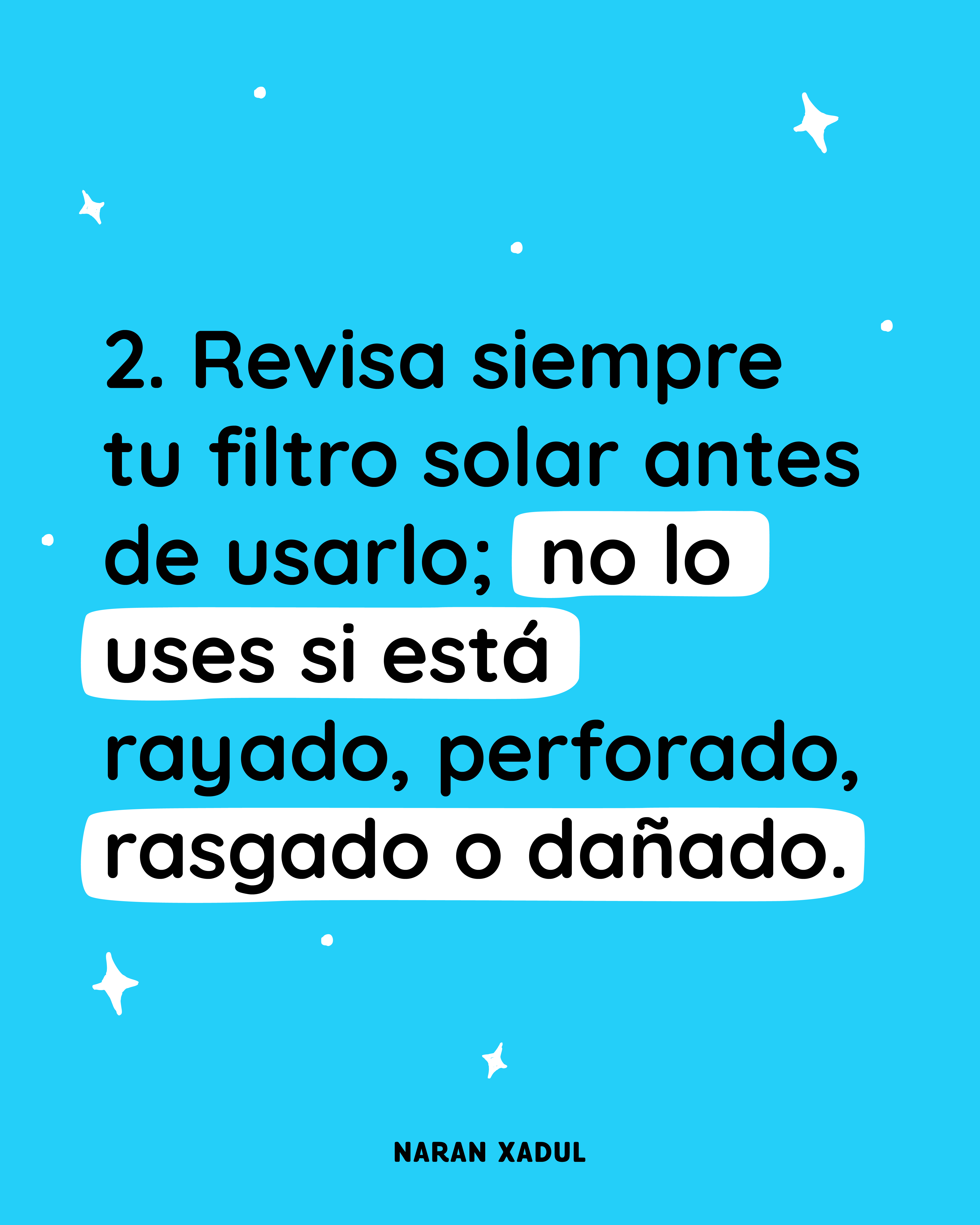 2. Revisa siempre tu filtro solar antes de usarlo; no lo uses si está rayado, perforado, rasgado o dañado.